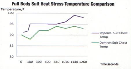 實驗條件:工作人員身穿不同防護(hù)服,以3.5英里/小時的速度在跑步機(jī)上慢跑3分鐘后測量全身防護(hù)服的溫度,再隨時間推移不斷測量防護(hù)服內(nèi)的溫度變化。藍(lán)色曲線代表通用防護(hù)服,綠色曲線代表使用Demron材料制成的防護(hù)服。DemronEQ \o\ac(○,R)R的防護(hù)性能