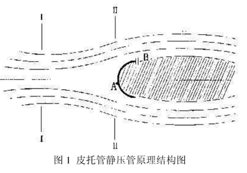 皮托管的測量原理是基于伯努利方程在空氣中應用的一個實例,如圖1所示。當理想流體均勻的平行流向靜止物體時,設想其中一條撞在物體上(即圖1中的A點),在此處流體發生分岔,A點成為滯止或駐點,A的流速為零,V-A=0。