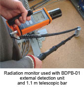 白俄羅斯ATOMTEX AT1125B 為一款輻射檢測儀,用于測量γ輻射劑量及劑量率,外接探頭BDPB-01與主機(jī)連接后,還可測量β表面沾污及放射性核素的活度。該款輻射檢測儀能夠用于搜查放射源、檢測廢金屬等。儀器內(nèi)置 NaI(TI)閃爍體探測器,可快速*地對(duì)較小的輻射改變做出響應(yīng)。 此外,儀器的校正功能(能量范圍 0.05...3MeV),使得儀器的劑量率測量更加*。BDPB-01 帶有 1.7m 延長桿, 使得測量非常方便。
